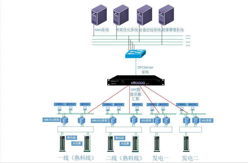 03、方案介绍海螺水泥厂底层控制系统熟料线及水泥磨DCS控制系统为ABB系统,发电为IFIX系统,网闸通过OPC协议从熟料线、水泥磨、发电系统取模拟量数据转发标准OPCServer,能管系统、巡检系统、MES系统从网闸转发的OPCServer取数据。